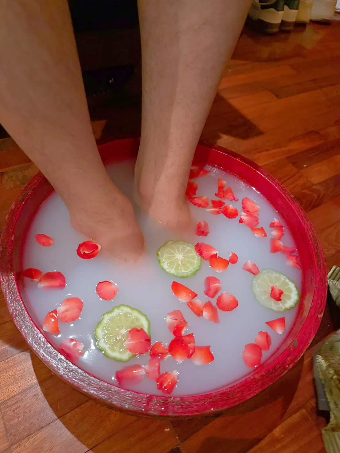 เป็นการบำรุงเท้าและฝ่าเท้าโดยเริ่มต้นด้วยการขัดด้วยสมุนไพรไทย เพื่อขจัดเซลล์เก่าให้หลุดออกไป จากนั้นทำการนวดเพื่อความชุ่มชื้นและผ่อนคลายสุดท้ายด้วยการพอกและบำรุง จะทำให้ช่วงเท้าขาวและผิวสดใส